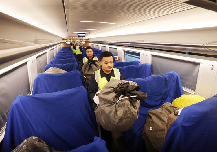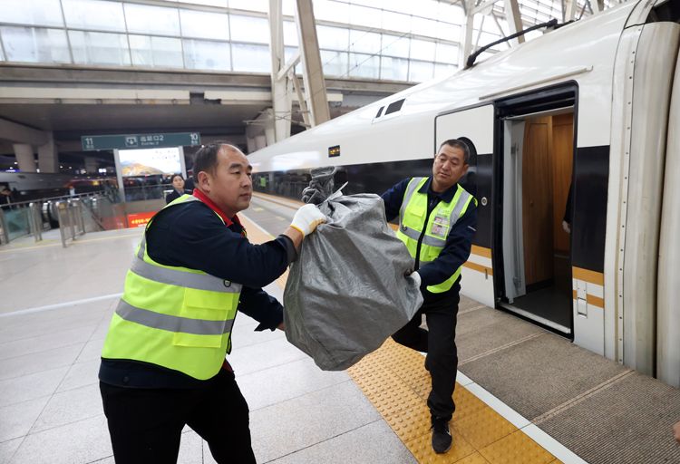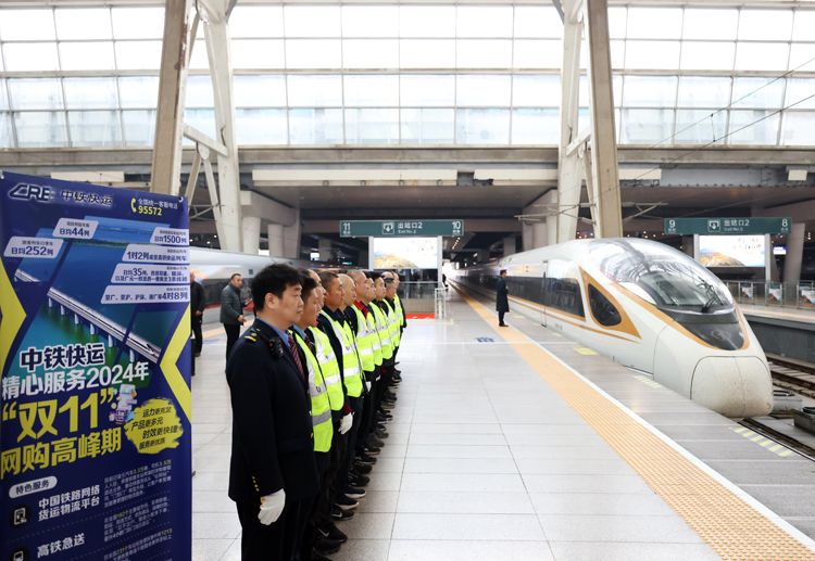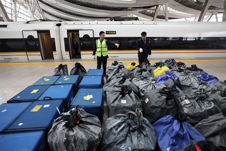 11月11日12时8分,从宜兴始发的G2578次列车抵达北京南站,这趟列车预留了一整节车厢装运快件,到站后快件将快速转入城市配送网。在“双11”期间,铁路部门安排了1500列以上的高铁载客动车组提供快递服务,其中44列动车组设有快件预留车厢,35列为无乘客的“高铁确认车”用于快递运输。