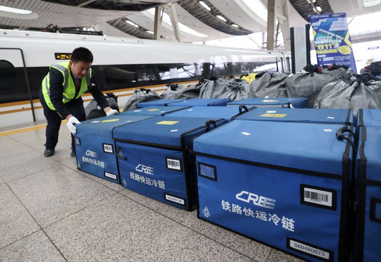 11月11日,北京南站,工作人员摆放冷链货物。北京南站营业部优化了医药冷链、温控货物和食品冷链的快运服务,实现了全程冷链和多温区精准控温运输。