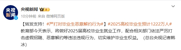 据@央视新闻微博消息,教育部今天表示,将做好2025届高校毕业生就业工作,配合相关部门依法严厉打击虚假招聘、恶意解约等违法违规行为,切实维护毕业生权益。(总台央视记者 韩冰)