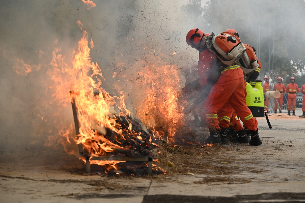 指战员再现战术运用、扑打明火、紧急避险、清理看守等要素的实战化训练过程。 图源:国家消防救援局河南机动队伍