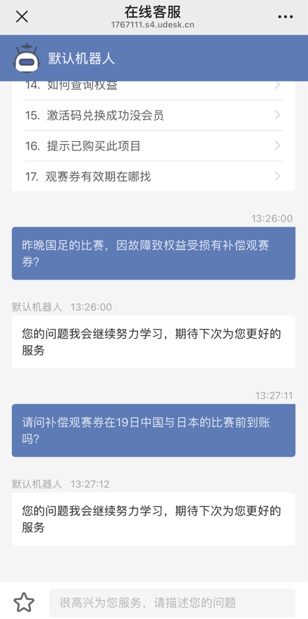 针对这些问题,新京报记者致电该平台热线电话,在重复拨打五次的过程中,智能语音客服均告知:“人工客服忙,您也可以在听到嘀声后留言,我们将在3个工作日内回复。”随后,记者在该平台公众号上留言询问客服“补偿观赛券到账”问题,但也只能得到“默认机器人”的机械性回复。