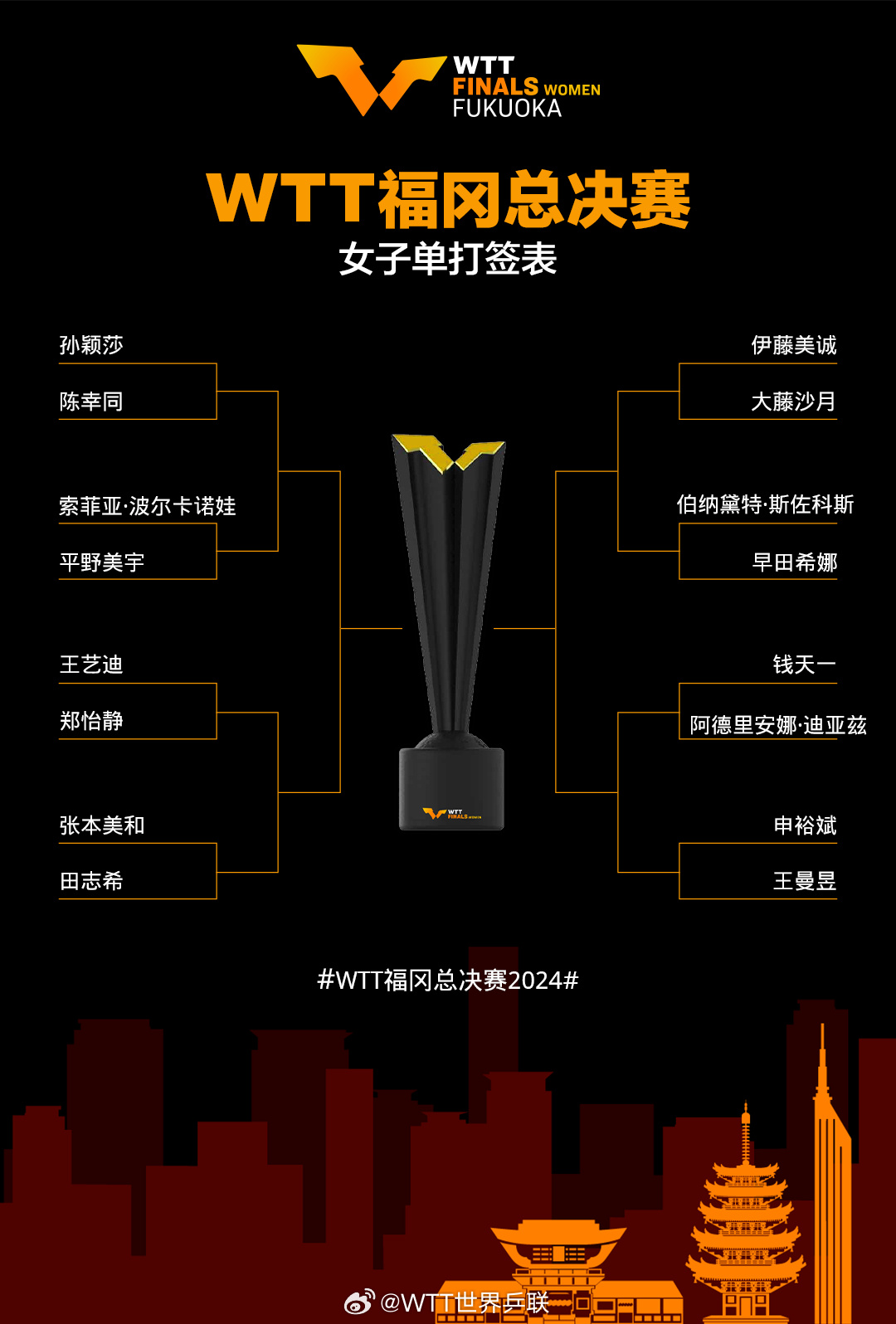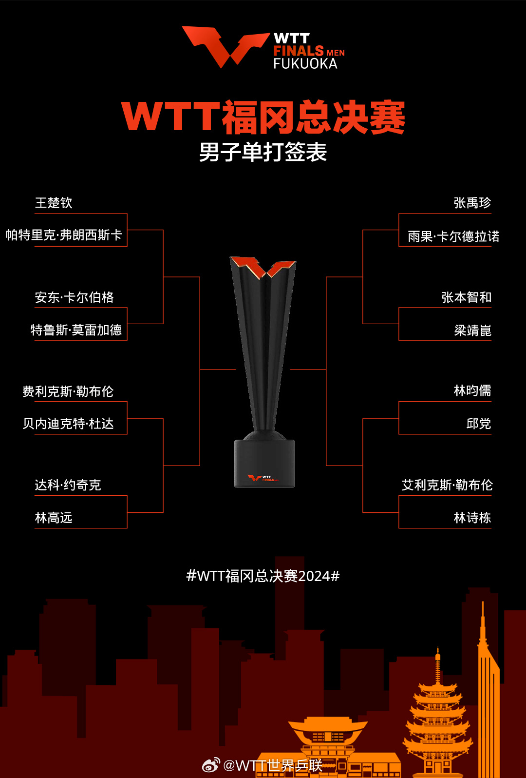 新京报讯 11月18日,2024年WTT(世界乒乓球职业大联盟,简称“世乒联”)福冈总决赛举行了抽签仪式。男单首轮,王楚钦对阵世界排名第11位的32岁德国老将弗朗西斯卡,林诗栋对阵法国球员大勒布伦。孙颖莎与陈幸同上演中国“内战”。