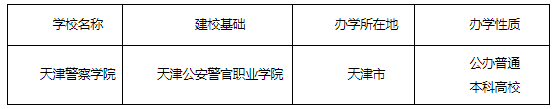 根据《中华人民共和国高等教育法》、《普通本科学校设置暂行规定》等法律法规和规定,按照教育部有关工作部署和我市高校设置工作相关要求,经我市高校设置委员会专家考察和评议,现对拟向教育部申报的以天津公安警官职业学院为基础设立天津警察学院事项进行公示。