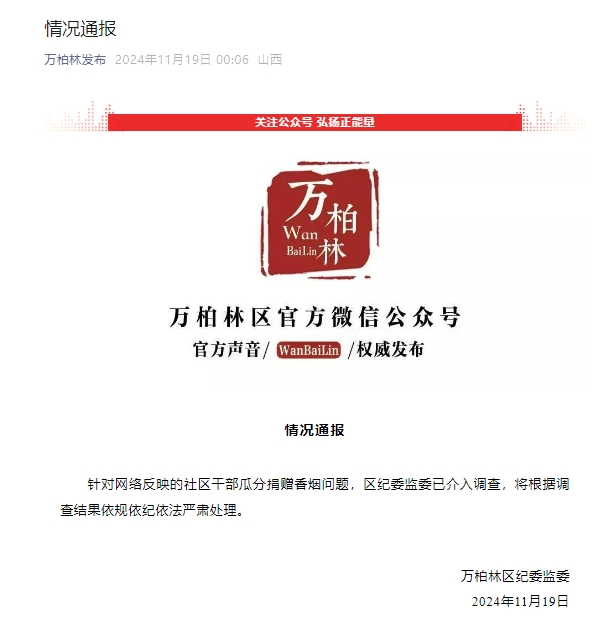 新京报讯 据万柏林发布消息,针对网络反映的社区干部瓜分捐赠香烟问题,区纪委监委已介入调查,将根据调查结果依规依纪依法严肃处理。