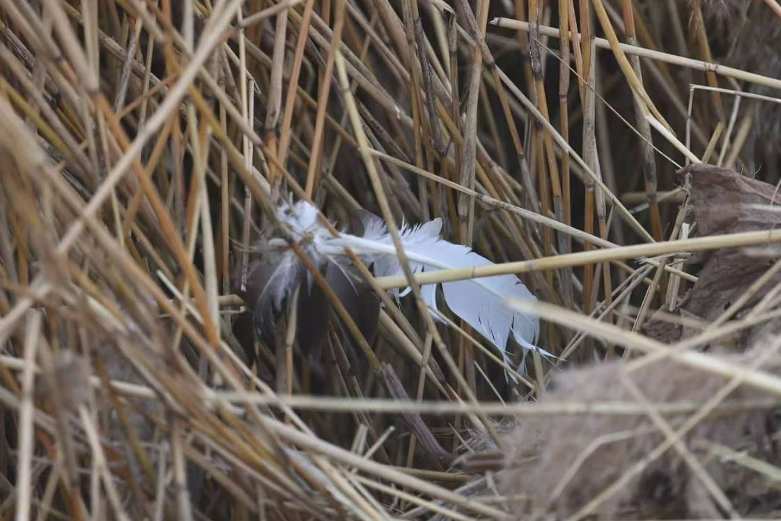 11月19日,圆明园曲院风荷,黑天鹅抱窝处旁边有一根大羽毛,周围没有打斗的痕迹。新京报记者 浦峰 摄