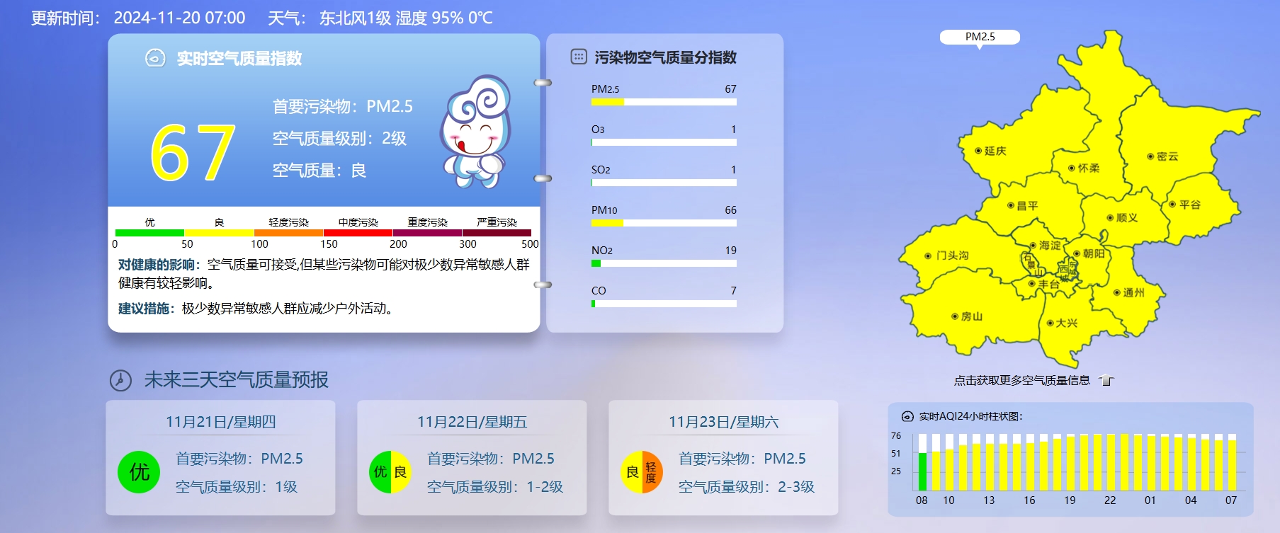 据北京市生态环境监测中心今早7时数据,目前实时空气质量指数67,空气质量良。