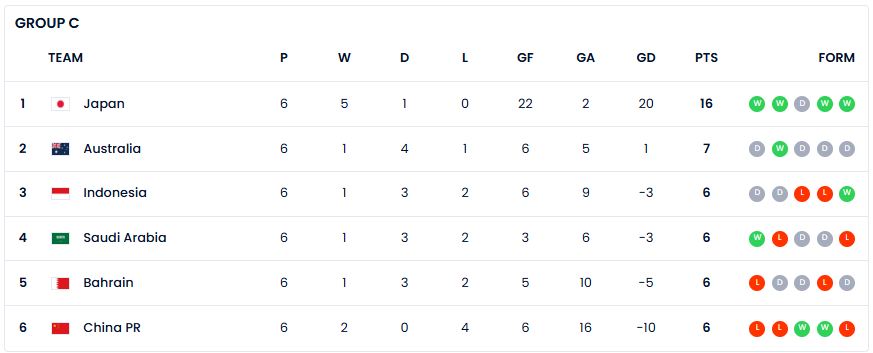 目前,澳大利亚1胜4平1负积7分,继续排名小组第二。印尼、沙特、巴林均1胜3平2负积6分,分列三至五名。