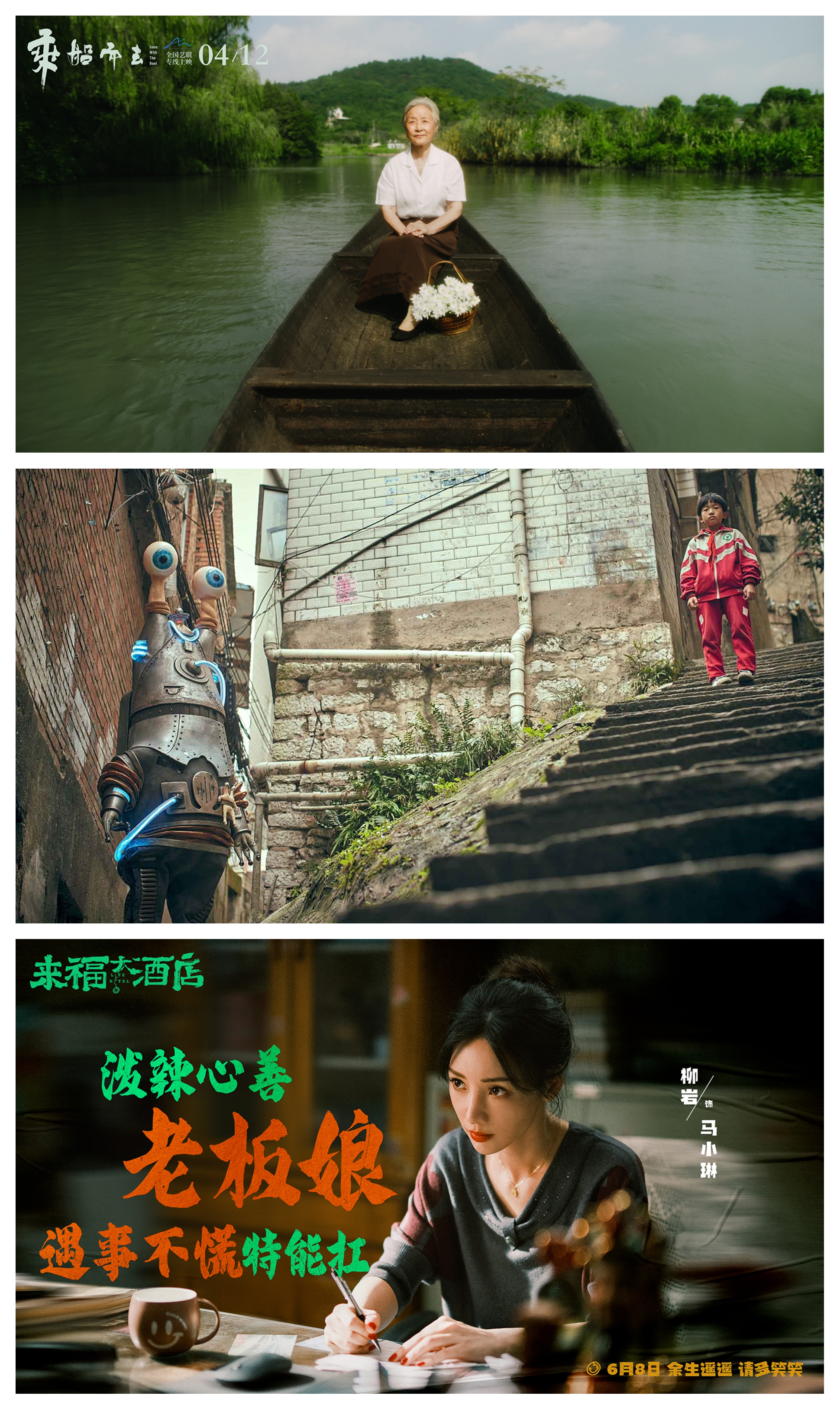 从上至下分别为《乘船而去》《朱同在三年级丢失了超能力》《来福大酒店》剧照。