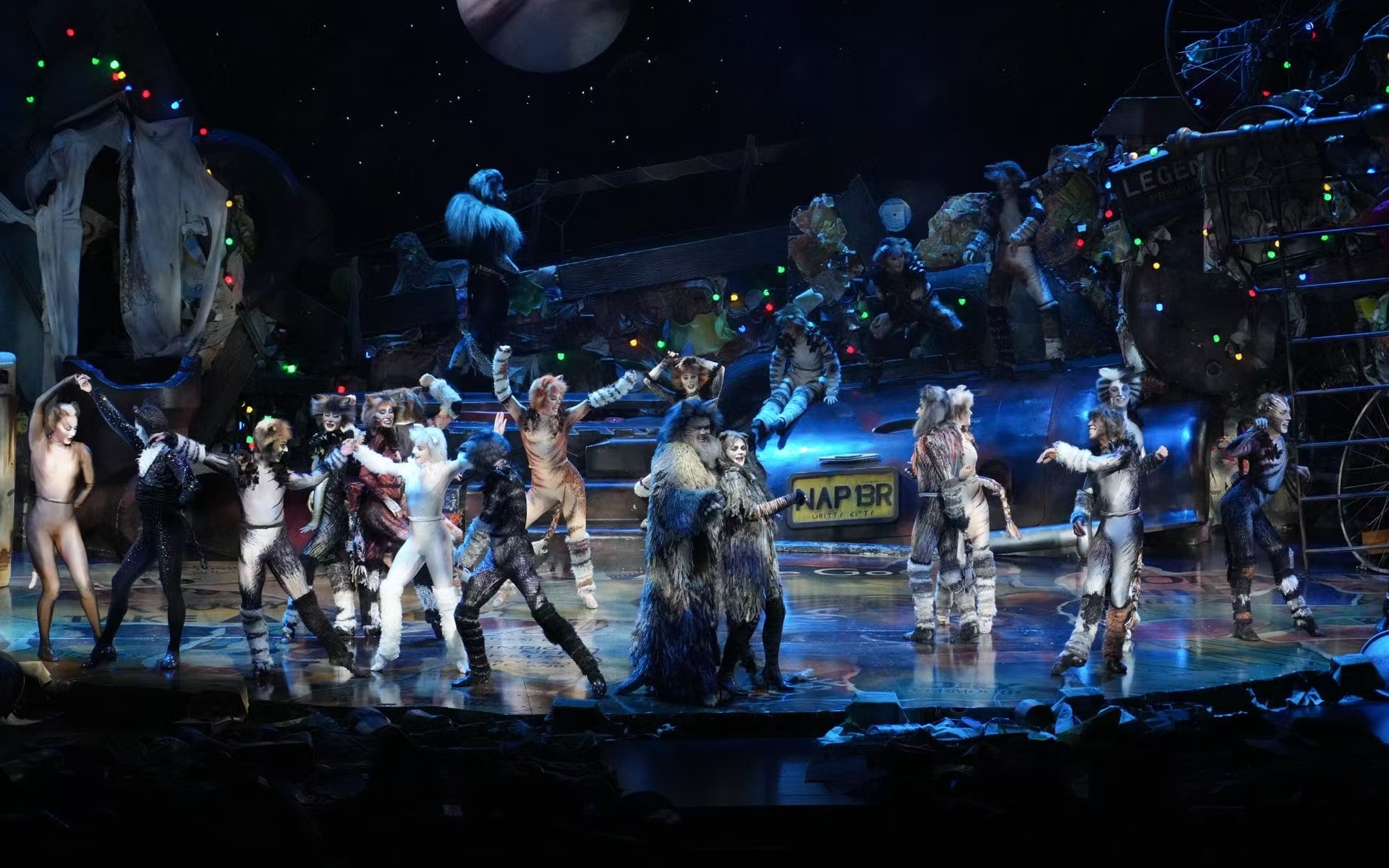 令人惊叹的舞台构造出猫族的“游乐场”。超大型的垃圾桶、废弃汽车、巨型轮胎,还有牙膏管、可乐罐,舞台上的千件道具,全部按猫的视角等比放大,还原出了猫眼中的世界。全套250多套的华美服装,全部手工打造的30多顶精美的“猫”发,效果逼真。已经在自媒体上刷屏的“猫咪”互动同样出现在北京艺术中心。中场时刻,“猫咪”们出没在观众席,现场变成大型“吸猫”现场,让观众惊喜不已,沉浸体验感十足。