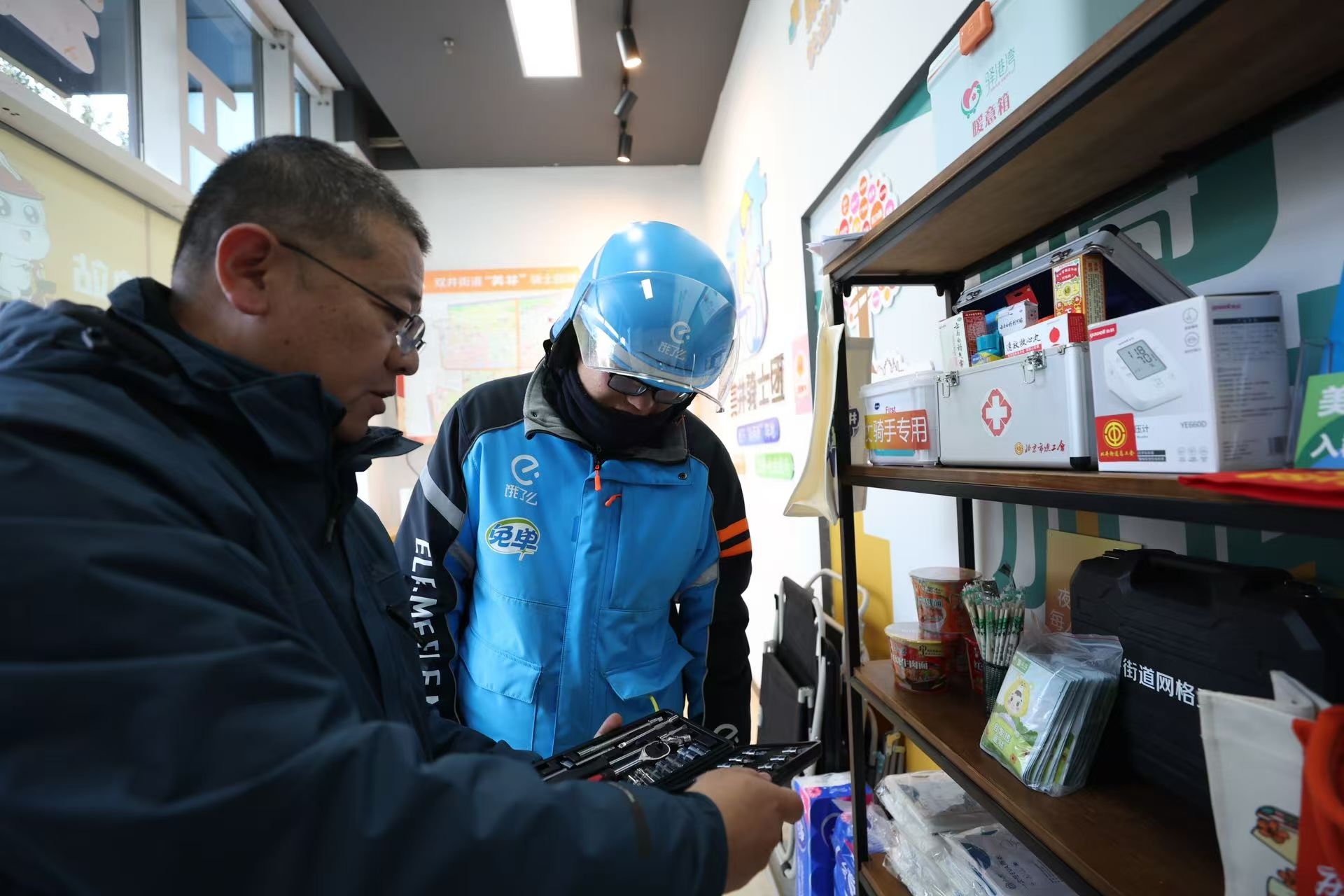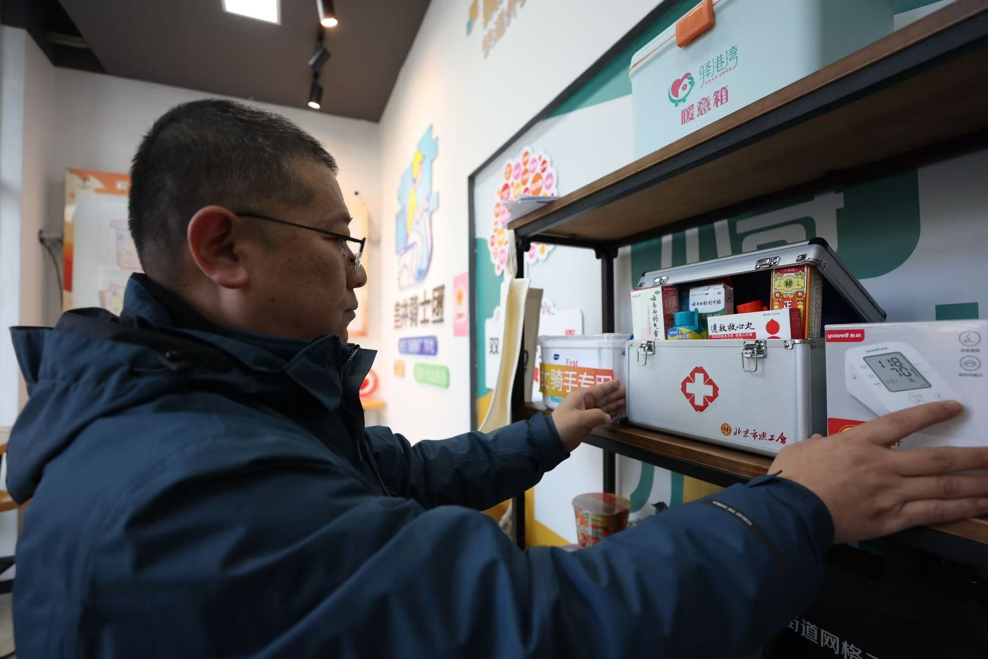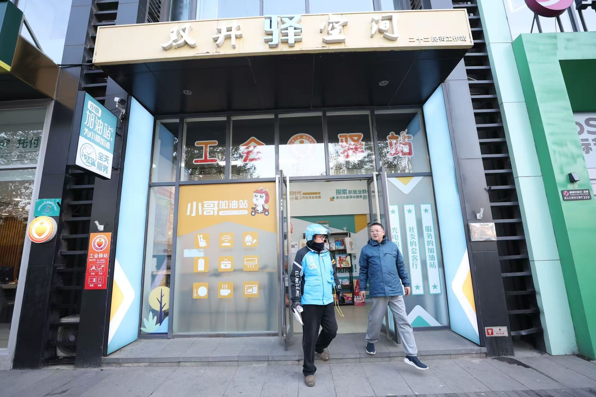 双井街道二十二院街艺术区的“小哥加油站”虽然不大,但各种物资一应俱全,全天候、全时段为周边工作的快递外卖骑手、网约车司机等新就业群体提供服务。