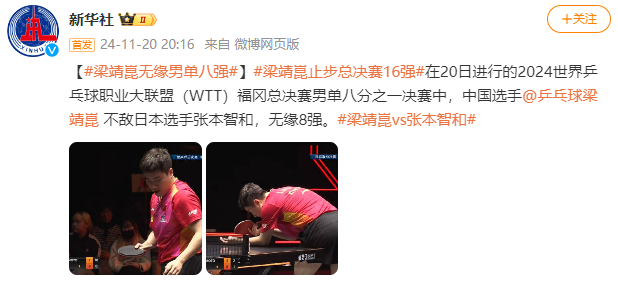据新华社微博消息,在20日进行的2024世界乒乓球职业大联盟(WTT)福冈总决赛男单八分之一决赛中,中国选手梁靖崑不敌日本选手张本智和,无缘8强。