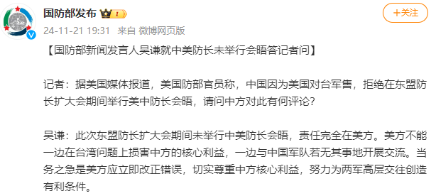 新京报讯 据国防部发布官博消息,国防部新闻发言人吴谦就中美防长未举行会晤答记者问。