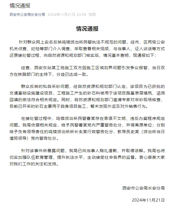 群众反映鸣犊派出所民警执法不规范 西安长安警方通报