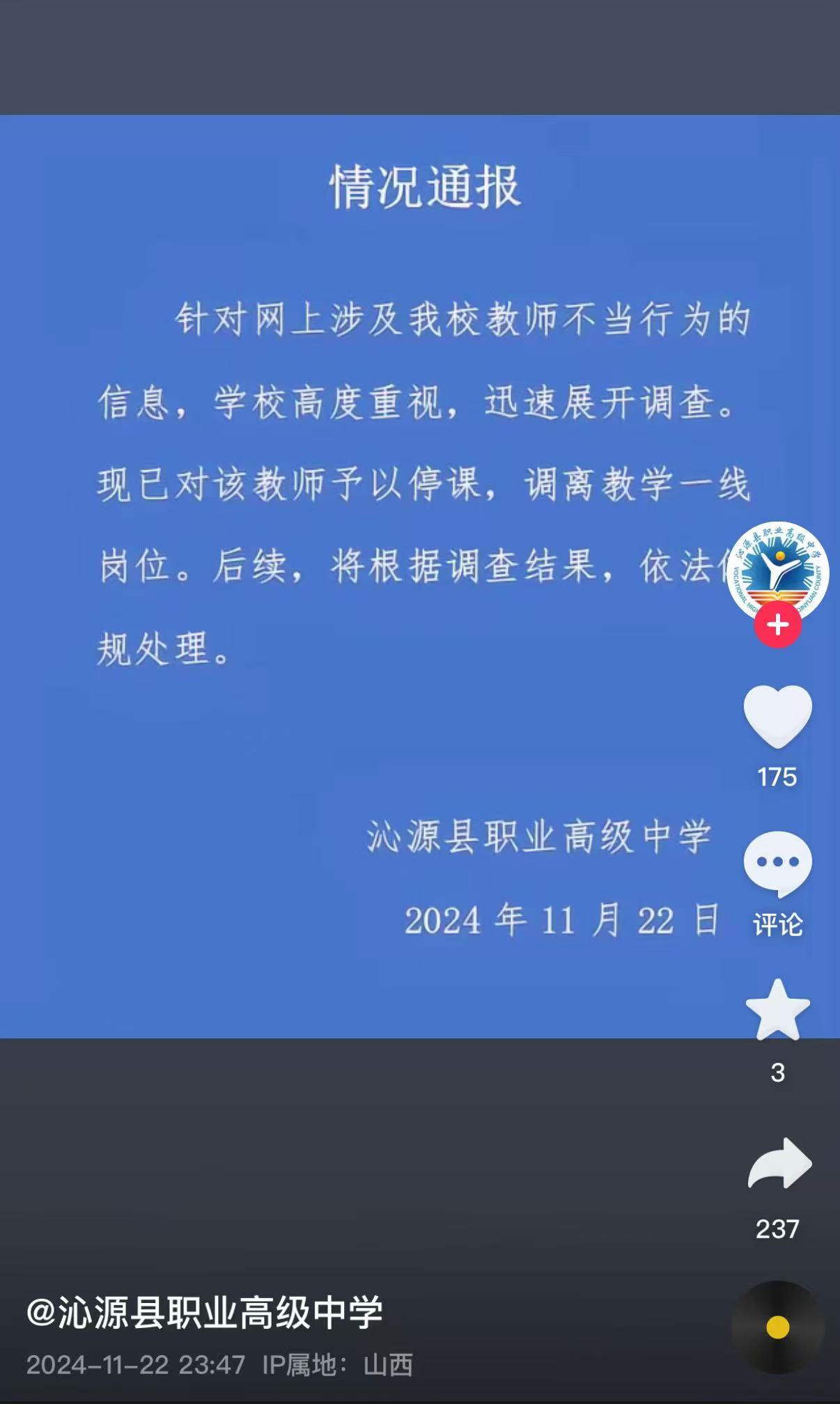 新京报讯 11月22日,沁源县职业高级中学在其抖音账号发布情况通报:针对网上涉及该校教师不当行为的信息,学校高度重视,迅速展开调查。现已对该教师予以停课,调离教学一线岗位。后续,将根据调查结果,依法规处理。