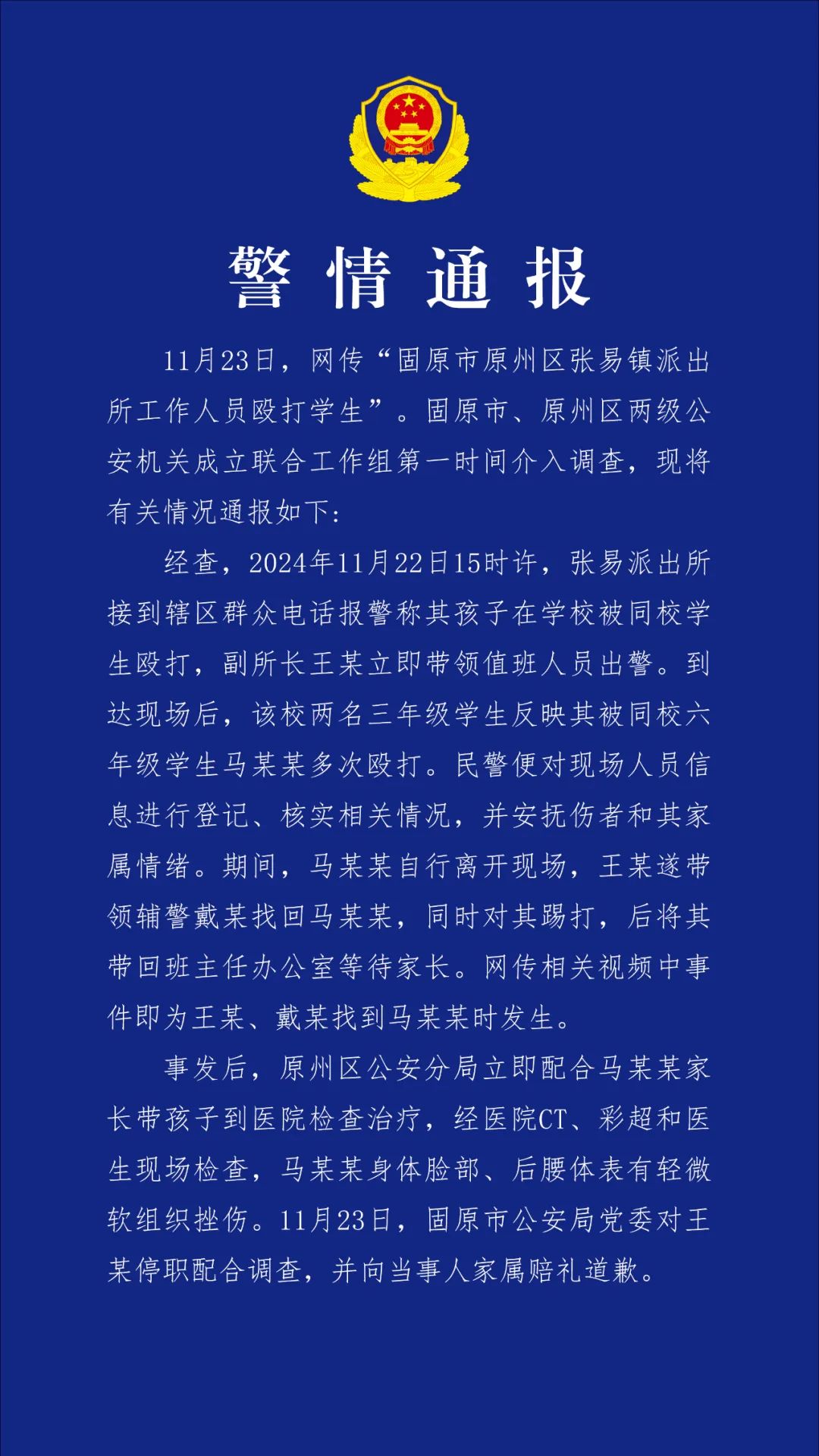 宁夏固原市原州区公安分局11月24日发布警情通报。11月23日,网传“固原市原州区张易镇派出所工作人员殴打学生”。固原市、原州区两级公安机关成立联合工作组第一时间介入调查,现将有关情况通报如下: