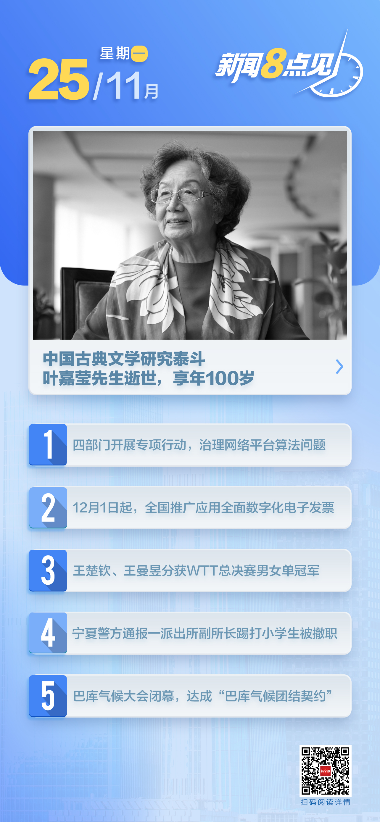 11月24日,南开大学发布讣告。南开大学讲席教授、诗人、中国古典文学研究泰斗叶嘉莹先生于11月24日在天津逝世,享年100岁。叶嘉莹先生遗体告别仪式将于11月30日在天津举行。(南开大学)阅读全文>>>
