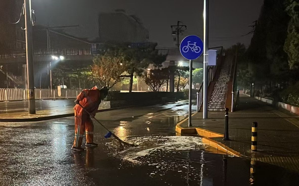 11月25日凌晨4时57分,环卫工人在北京市朝阳区劲松路清理积水。北京市城管委供图
