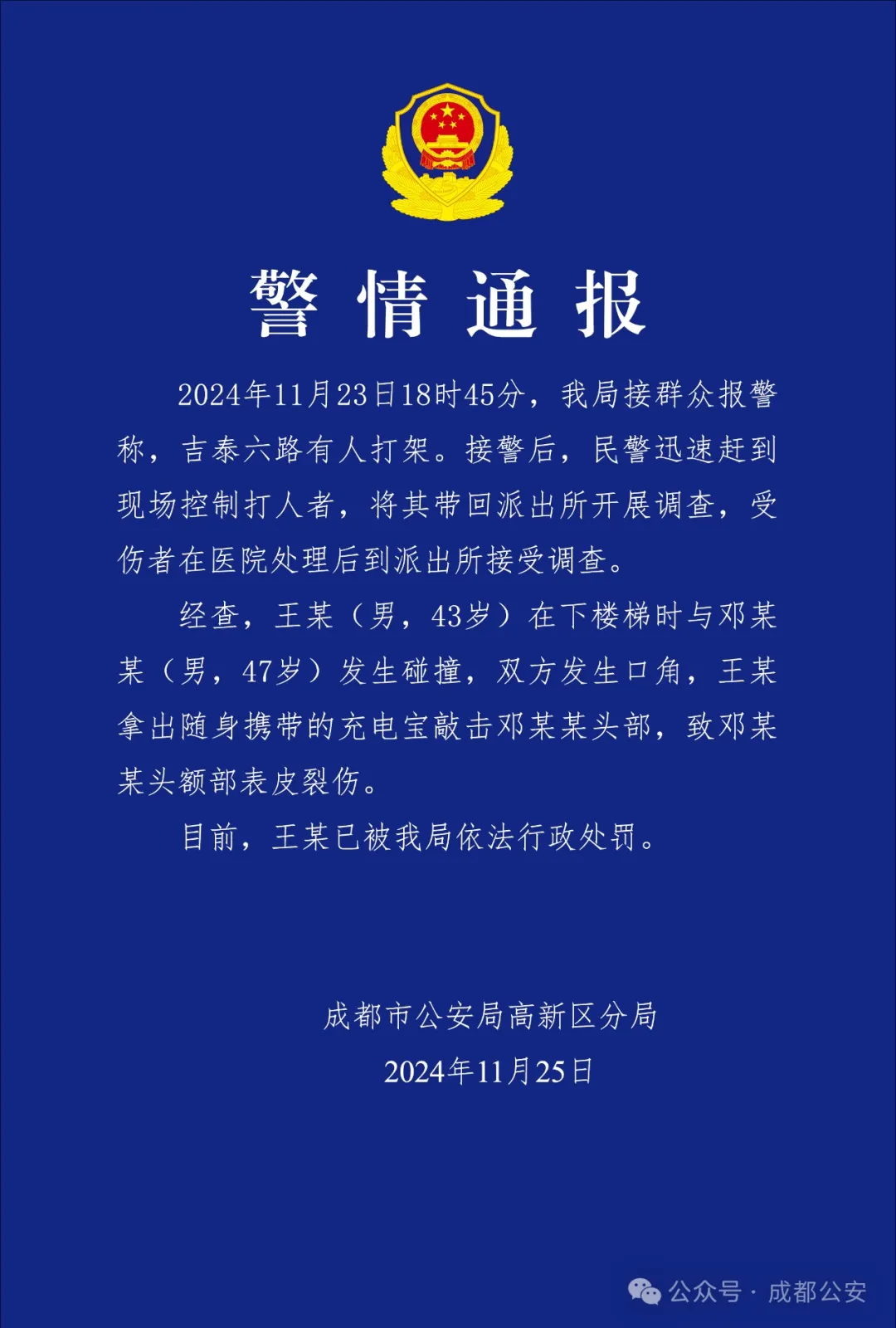 成都公安:男子用充电宝敲击他人头部致其受伤,被行政处罚