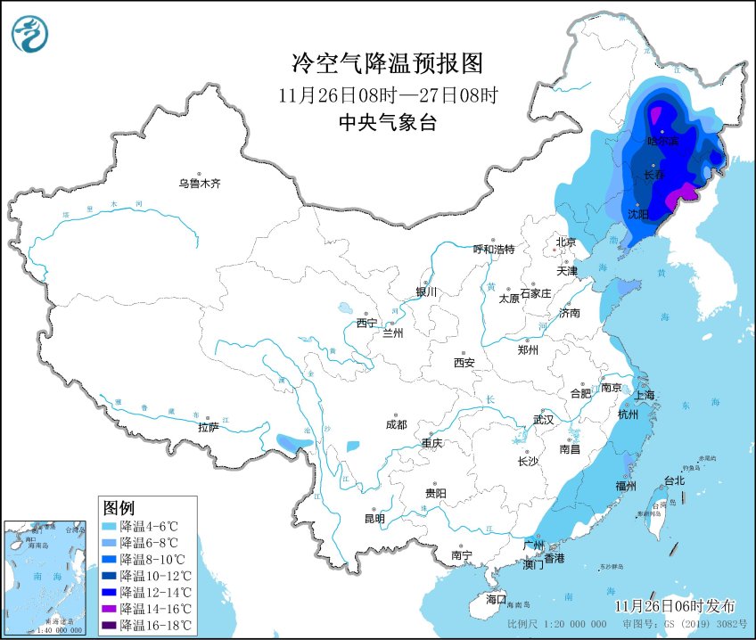 中央气象台11月26日6时继续发布寒潮黄色预警。受寒潮影响,预计11月26日08时至11月28日8时,东北地区大部、山东半岛、浙江、福建北部等地将先后降温6~10℃,其中,黑龙江大部、吉林东部、辽宁东北部部分地区降温12~16℃,局地18℃以上。28日前后,最低气温0℃线将南压至苏皖北部至河南中南部一带,其中,大别山、黄山等高海拔山区最低气温也将低于0℃。