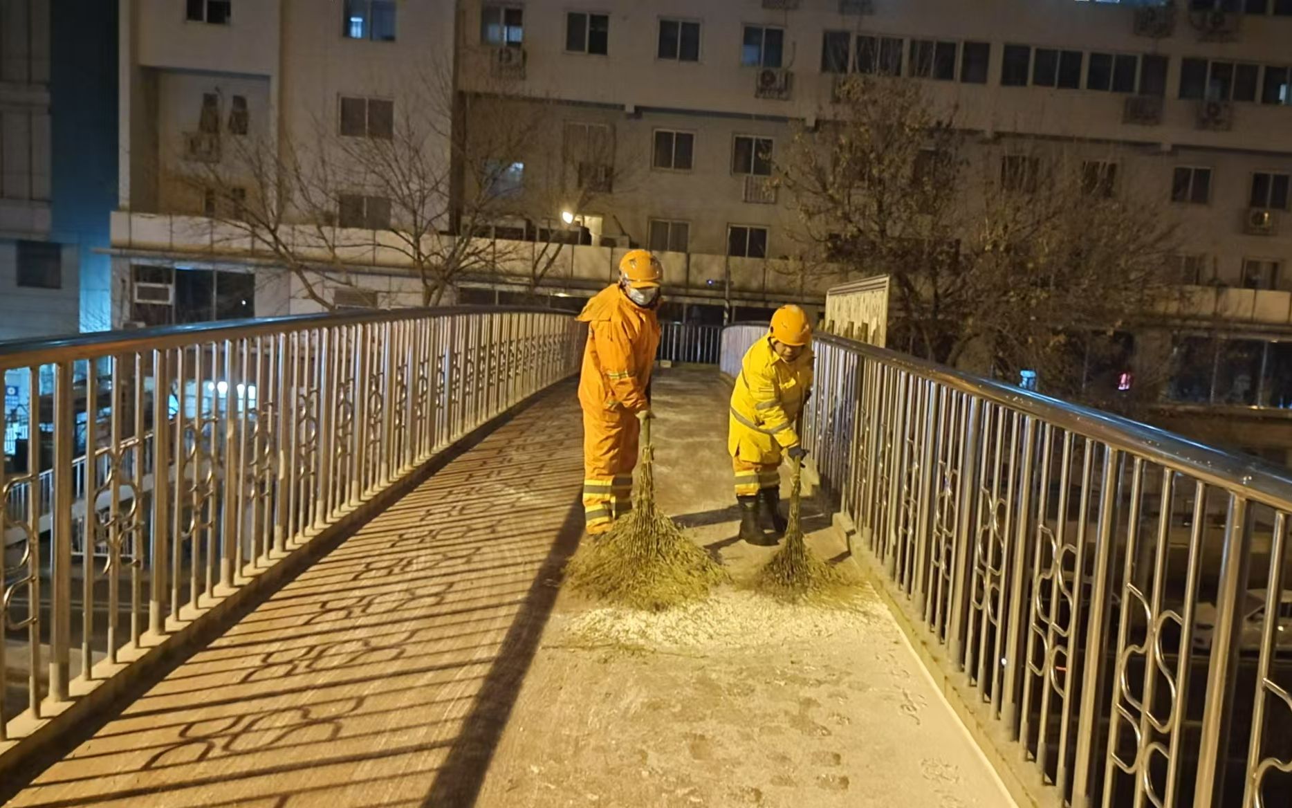 11月26日晚,环卫工人在清理过街天桥上的积雪。北京市城管委供图