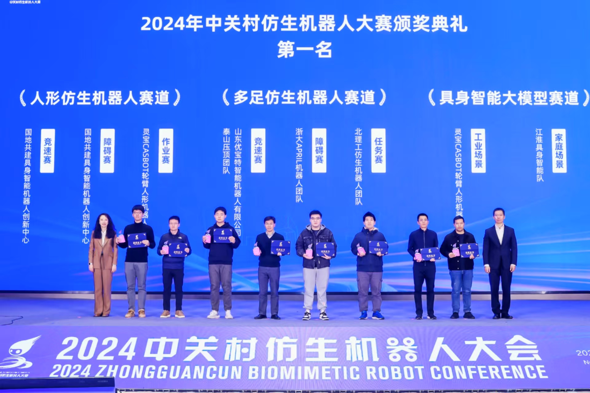 新京报讯(记者吴为)11月27日,2024年中关村仿生机器人大会在海淀举行。上百支创新团队经过激烈的初赛、复赛和决赛,最终30余支优秀团队/企业脱颖而出,夺得人形仿生机器人、多足仿生机器人、具身大模型以及其他仿生机器人四个赛道的45项大奖。