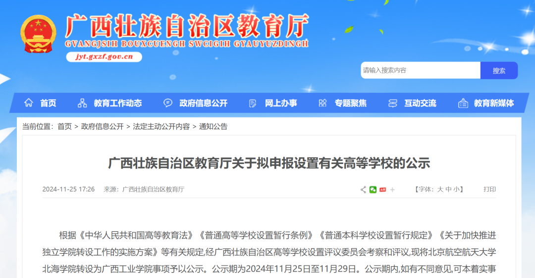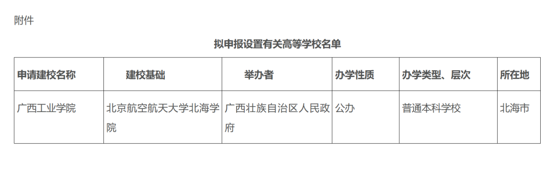 新京报讯 据广西壮族自治区教育厅消息,近日,《广西壮族自治区教育厅关于拟申报设置有关高等学校的公示》发布,北京航空航天大学北海学院将转设为广西工业学院,事项正在公示。