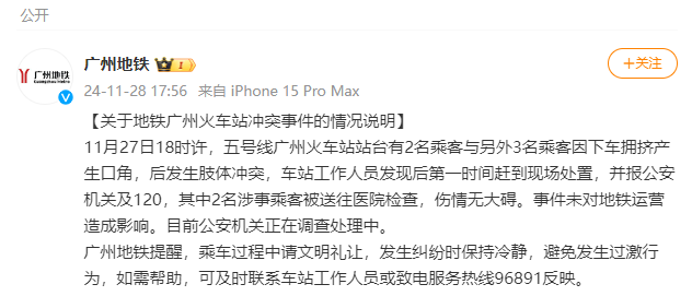 广州地铁:乘客因下车拥挤产生口角后发生肢体冲突,其中2人被送医