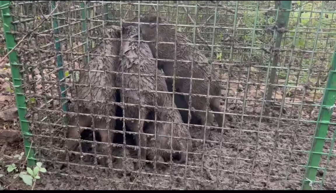 去年在南京老山杜仲林场,6头野猪被关进一只猎笼。受访者供图