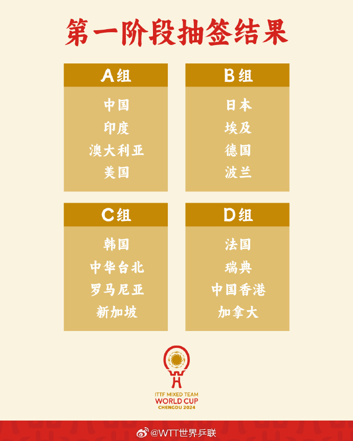 2024年成都国际乒联混合团体世界杯第一阶段抽签结果出炉