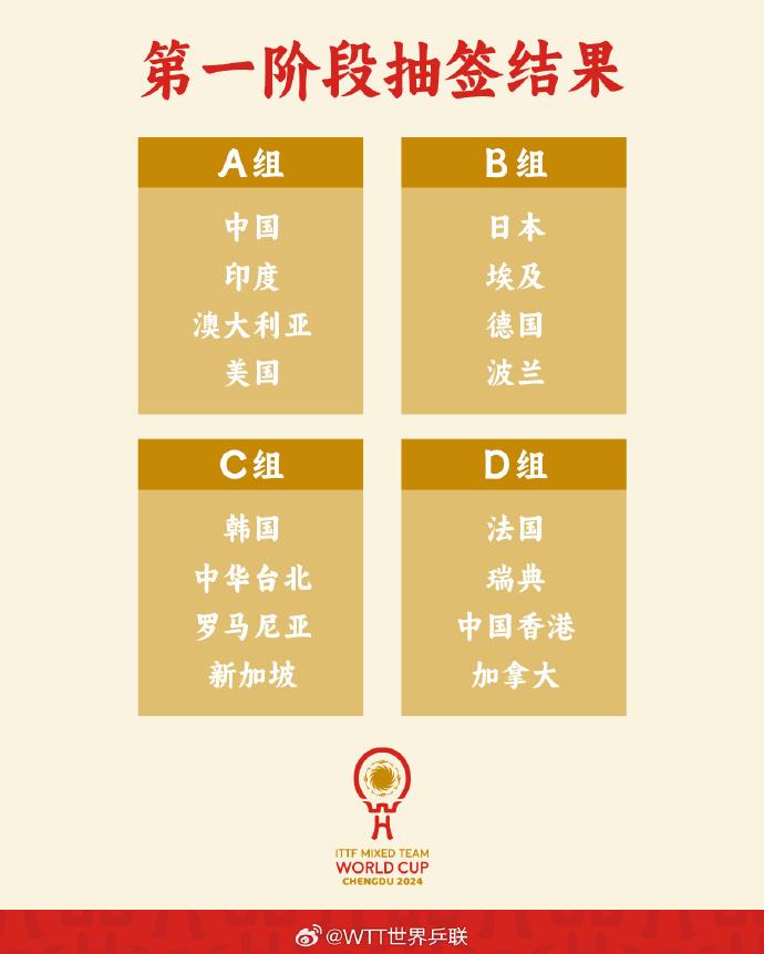 11月30日,2024年成都国际乒联混合团体世界杯抽签仪式举行。中国与印度、澳大利亚、美国同在A组。