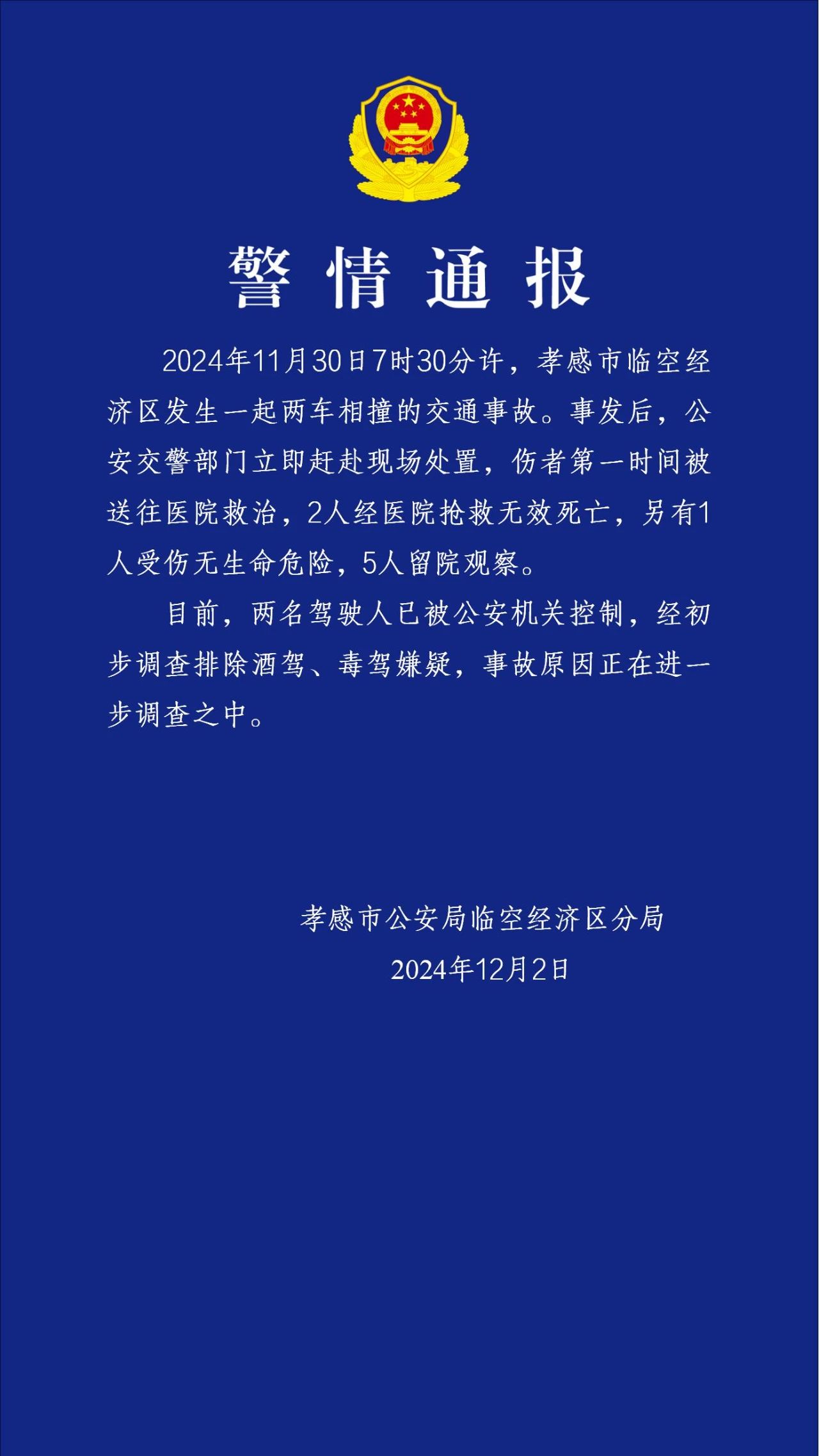 湖北孝感发生一起两车相撞事故致2死 警方:两名驾驶人已被控制