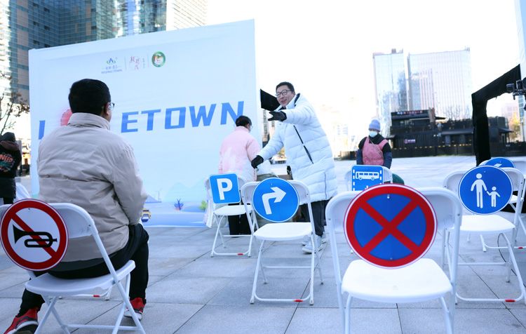 12月2日,为迎接第十三个全国交通安全日,以“文明交通 携手共创”为主题的北京经济技术开发区2024公共文明引导活动在大族广场举行。图为市民在参与交通标志抢答游戏。