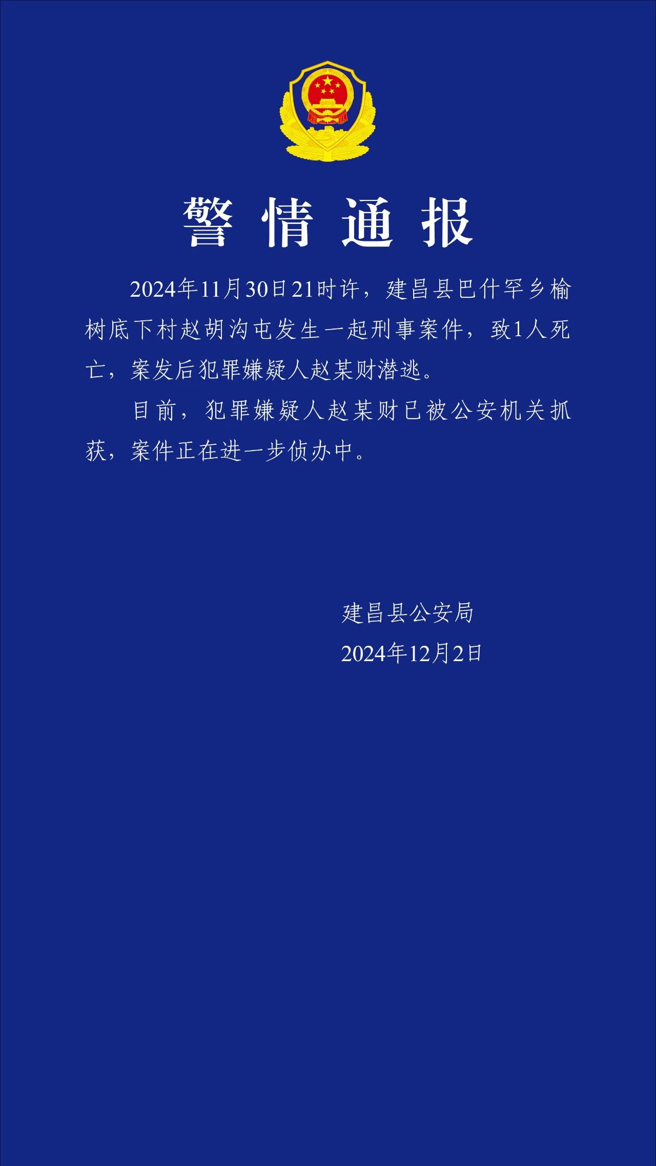 辽宁建昌县发生一起刑案致1死 犯罪嫌疑人被抓获