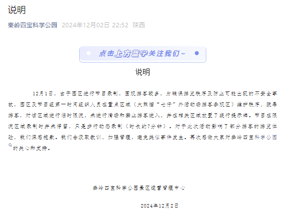 12月1日,由于园区进行节目录制,围观游客较多,为确保游览秩序及防止可能出现的不安全事故,园区及节目组第一时间组织人员在重点区域(大熊猫“七仔”外活动场游客参观区)维护秩序、疏导游客,对该区域进行临时限流,未进行清场和禁止游客进入,并在相关区域放置了绕行提示牌。节目在限流区域录制时并未停留,只是步行动态录制(时长约7分钟)。对于此次活动影响了部分游客的游览体验,我们深感抱歉。我们会汲取教训、加强管理,避免类似事件发生。再次感谢大家对秦岭四宝科学公园的关心和支持。
