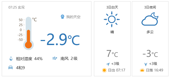 今天白天晴转多云,南风二三级,最高气温7℃;夜间多云间晴,南转北风一二级,最低气温零下3℃。