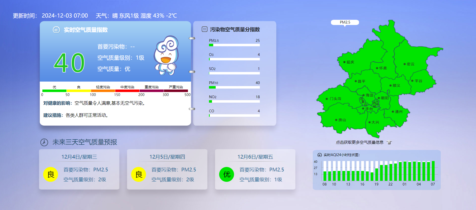 据北京市生态环境监测中心今早7时数据,目前实时空气质量指数40,空气质量优。