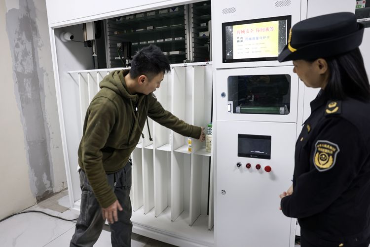 12月5日,北京市首台自助售(取)药机落地海淀区万寿路街道。该设备占地约20余平方米,可支持2500款日常药品的售卖与取用,极大满足周边居民多样化用药需求。图为工作人员演示机器自动补药流程。