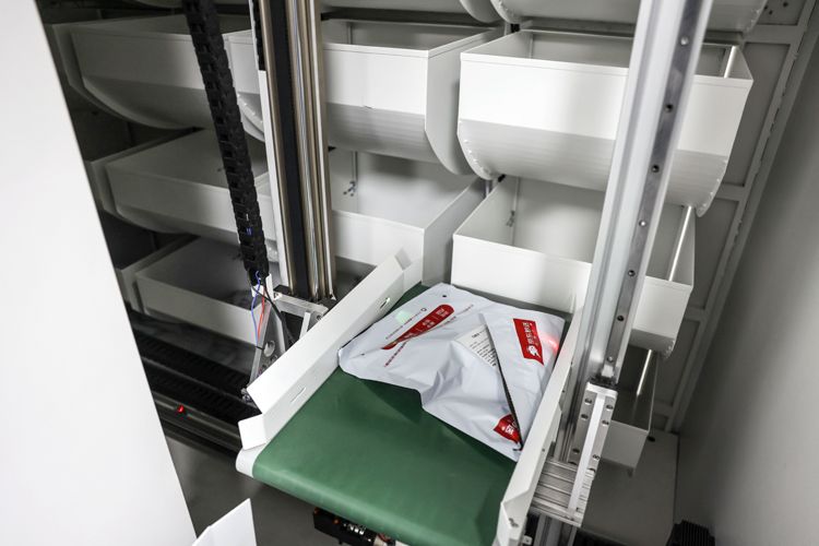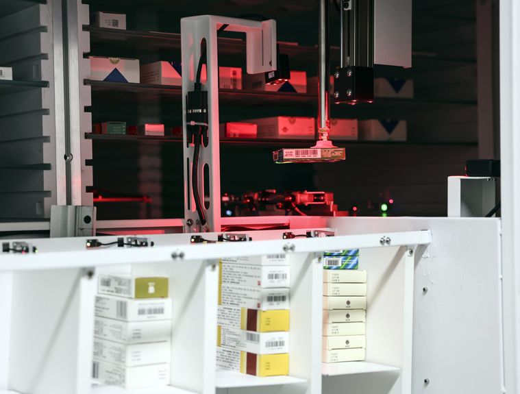 这台自助售(取)药机已获设立许可,正式投入使用后将具备7*24小时服务能力,满足周边居民用药需求并提供全天候药学服务咨询。据测试数据显示,自助售(取)药机出药准确率高达100%,全流程一次通过率超过99.9%。图为打包好的药通过传送带自动传到自助售(取)药机。