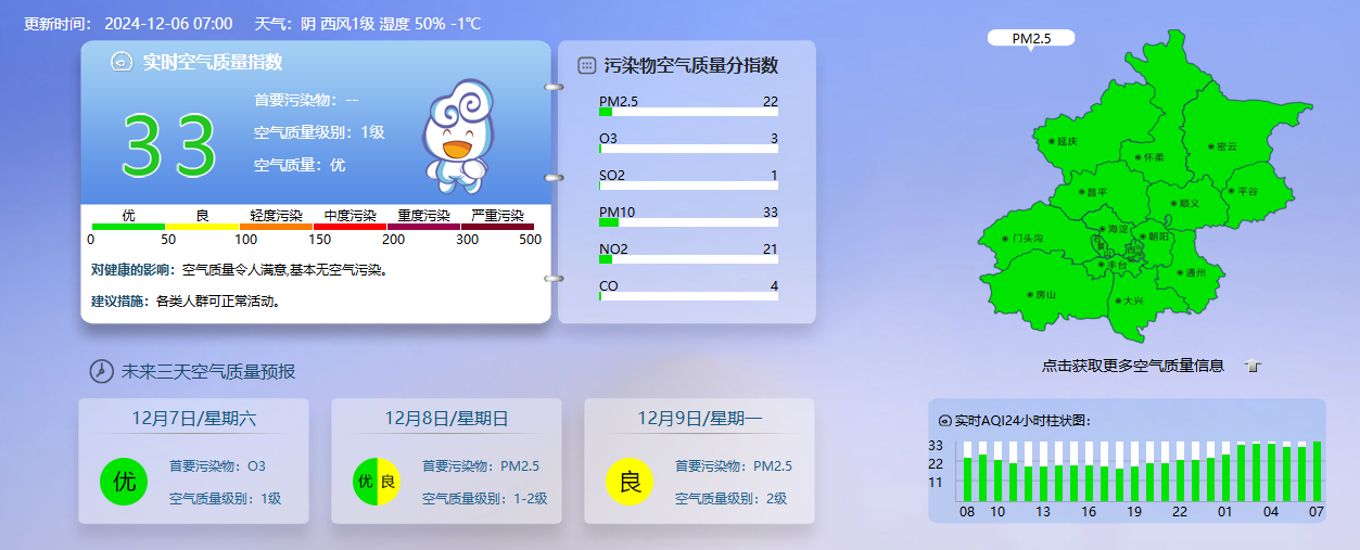 据北京市生态环境监测中心今早7时数据,目前实时空气质量指数33,空气质量优。