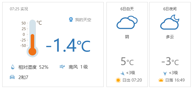 今日大雪,白天阴天间多云,西部北部有零星小雪或小雪,北风二三间四级,最高气温5℃;夜间阴(山区有零星小雪)转晴,北风三级左右,最低气温零下3℃。