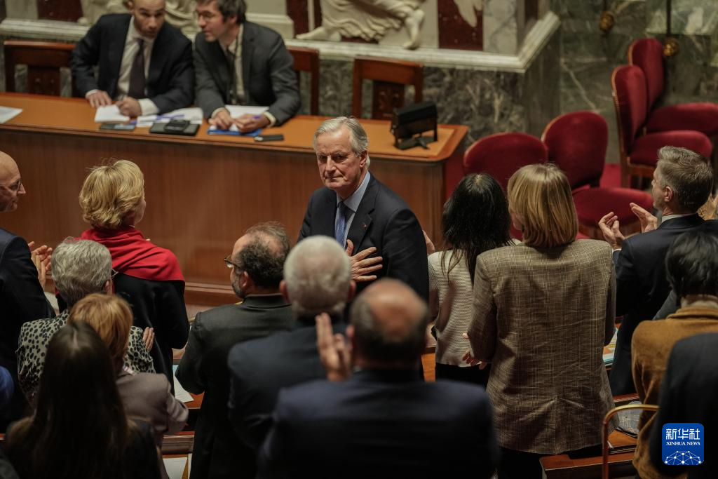 ▲12月4日,在法国巴黎,法国总理巴尼耶(中)在国民议会就对政府不信任动议投票表决前辩论上发言后离开。图/新华社