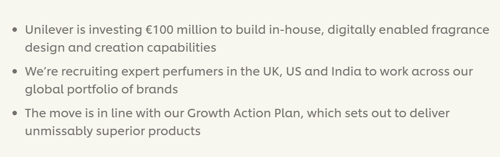 新京报贝壳财经记者了解到,此次对于内部香水研发能力的加码,将进一步提高联合利华对香水市场反应的灵敏度。据其首席研发官Richard Slater表示:“这项举措将使我们能够创造和开发自己的香水,并继续与我们在行业中重要的现有合作伙伴保持密切合作。”