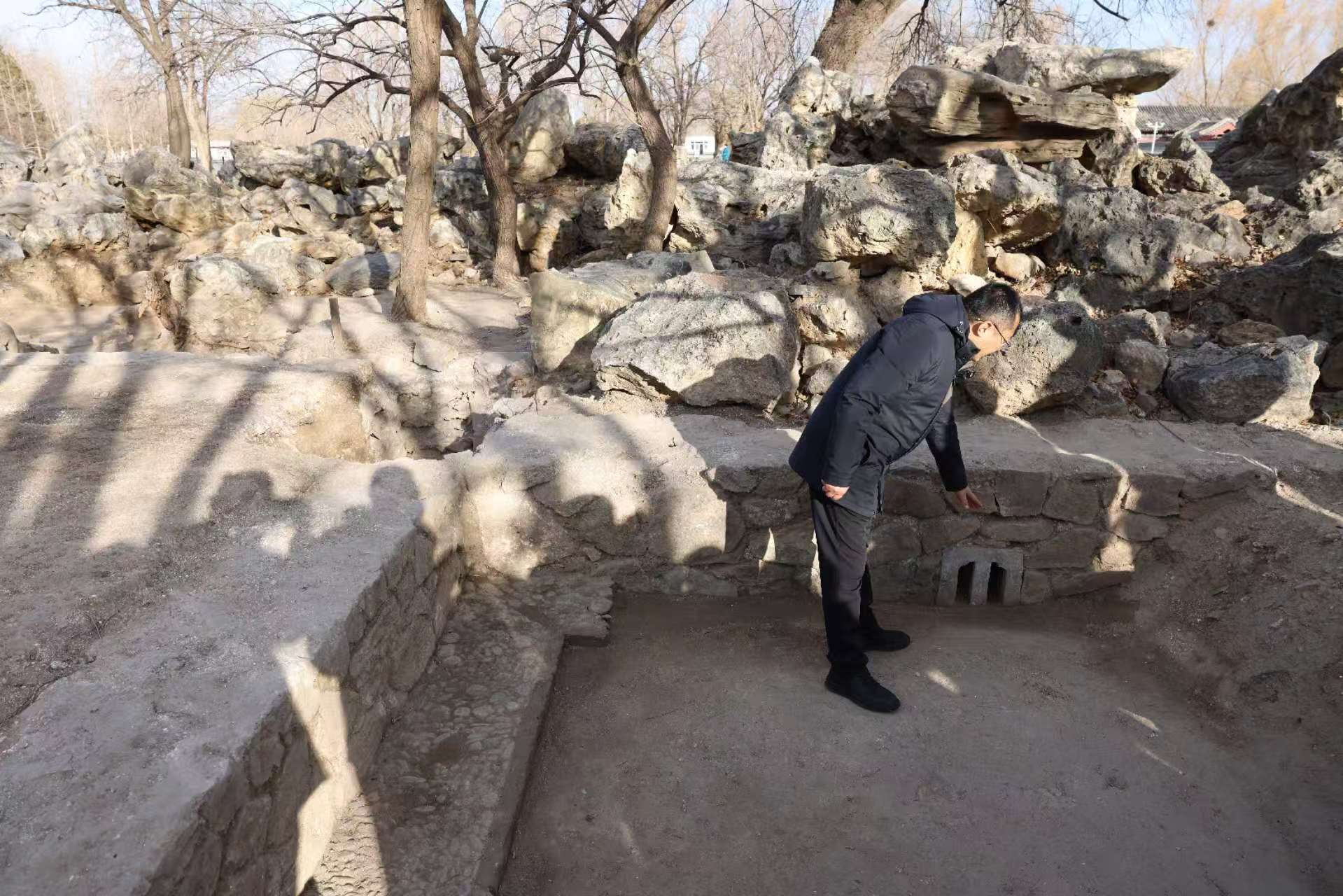 北京市考古研究院副院长张中华介绍南墙内发现的排水系统。新京报记者 浦峰 摄