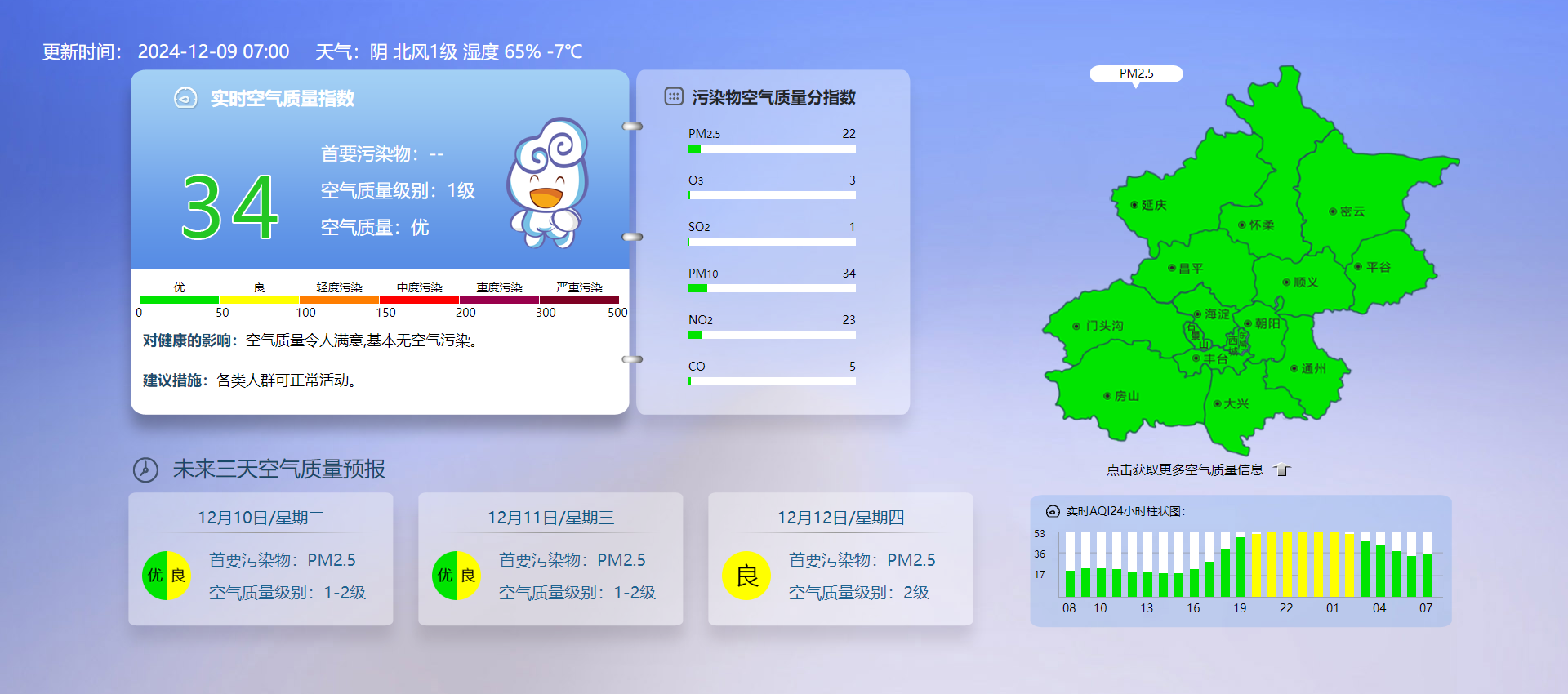据北京市生态环境监测中心今早7时数据,目前实时空气质量指数34,空气质量优。