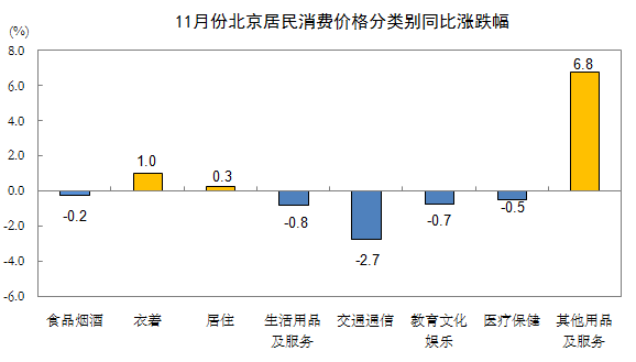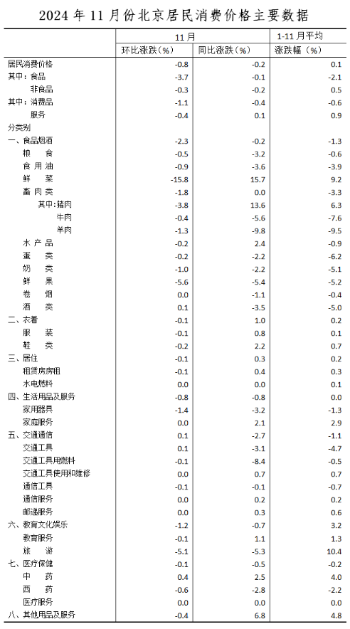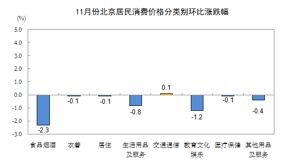 11月份,北京居民消费价格同比下降0.2%。其中,食品价格下降0.1%,非食品价格下降0.2%;消费品价格下降0.4%,服务价格上涨0.1%。