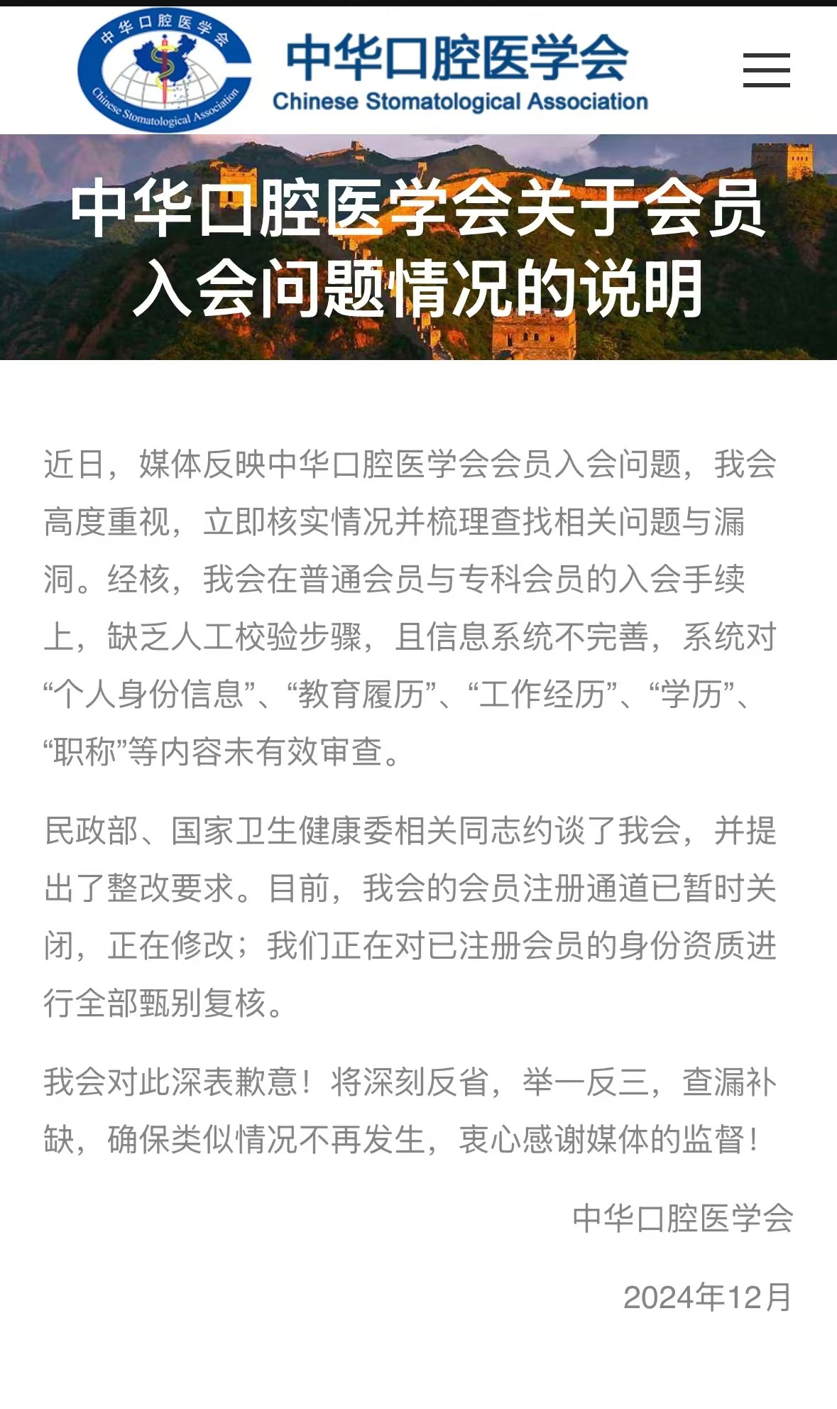 新京报讯 据中华口腔医学会网站消息,近日,媒体反映中华口腔医学会会员入会问题,中华口腔医学会高度重视,立即核实情况并梳理查找相关问题与漏洞。经核,中华口腔医学会在普通会员与专科会员的入会手续上,缺乏人工校验步骤,且信息系统不完善,系统对“个人身份信息”、“教育履历”、“工作经历”、“学历”、“职称”等内容未有效审查。