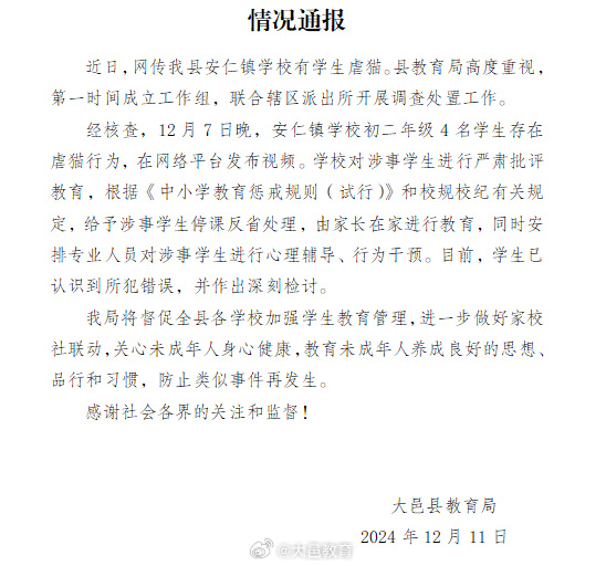 四川大邑通报4名初二学生虐猫:停课反省 安排心理辅导