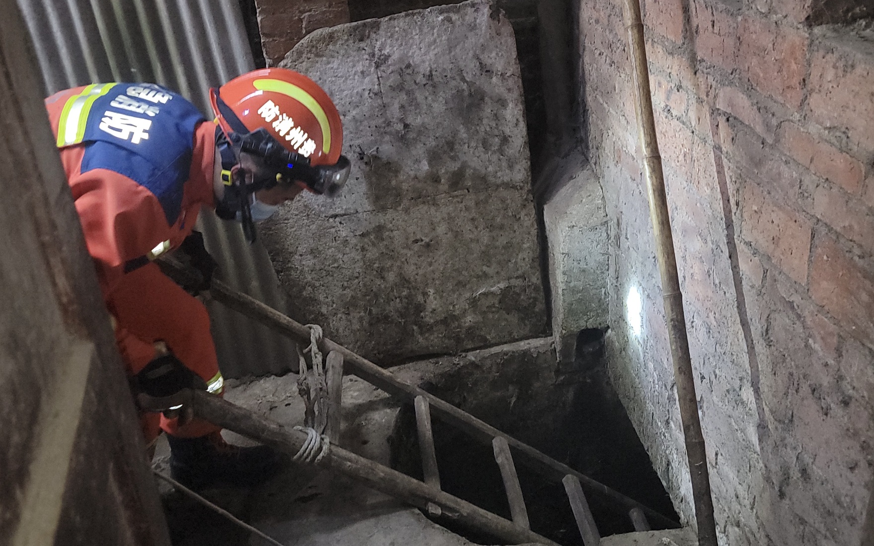 消防救援人员对粪池进行勘查。 图源:燎原路消防救援站