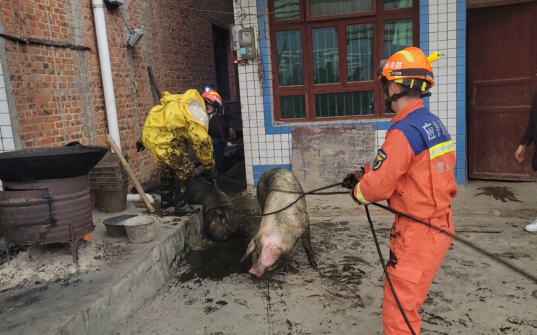 两头猪压垮盖板掉进粪池,贵州桐梓消防成功救出