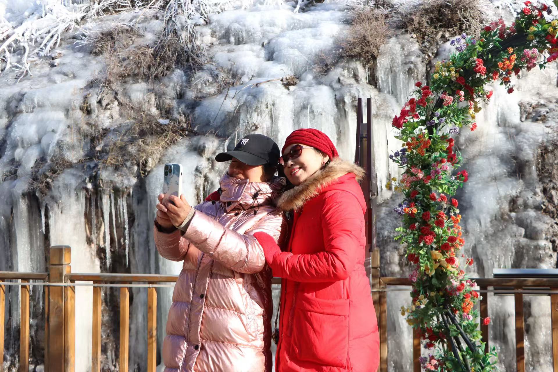 冰瀑奇观吸引游客打卡拍照。延庆区融媒供图